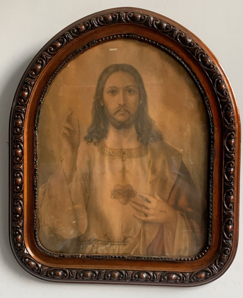 • MOLDURA DE MADEIRA ENTALHADA, COM IMAGEM DE CRISTO E VIDRO NO CENTRO, CONSERVADA57CM ALTURA